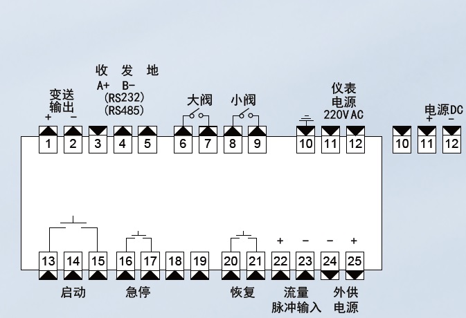 ■ 2点继电器输出。大阀、小阀二级控制或控制加瞬时流量下限报警(断料报警)。