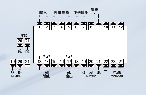 双显示,10点报警输出,变送输出,通讯接口:RS 232或RS 485,外供传感器电源