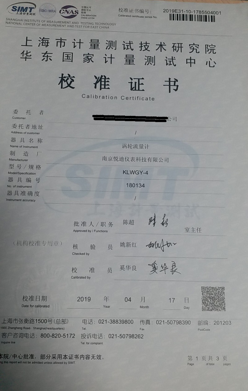 迪泰尔智能涡轮流量计已申请计量器具型式批准证书;证书编号:CPA:2018F079-32
