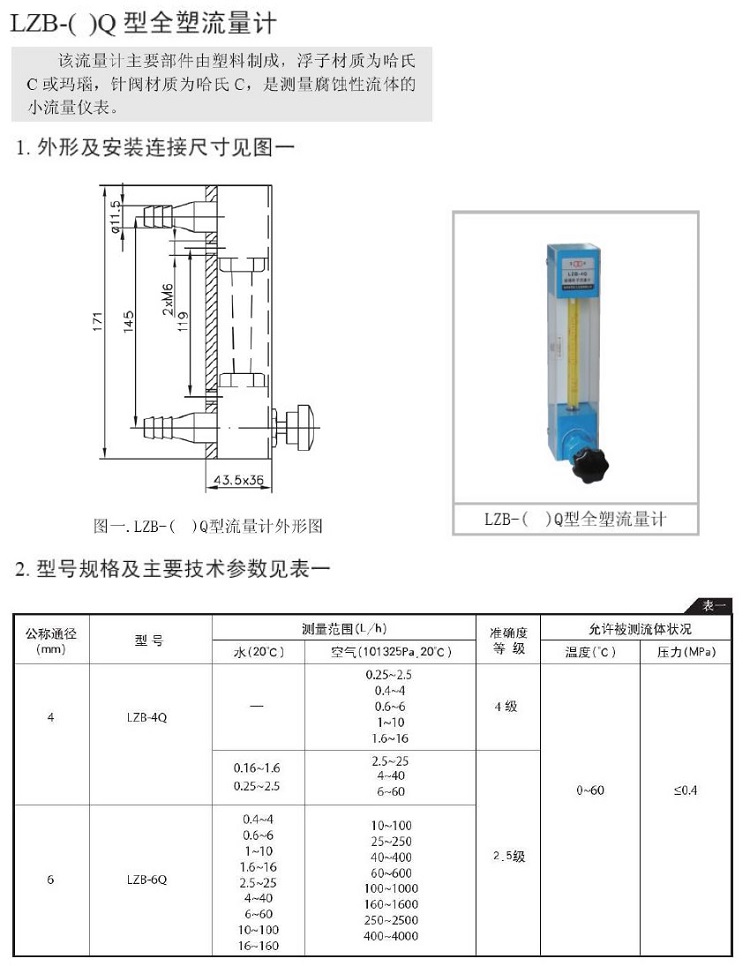 全塑流量计主要部件由塑料制成,浮子材质为哈氏 C 或玛瑙,针阀材质为哈氏 C ,是测量腐蚀性流体的小流量仪表。