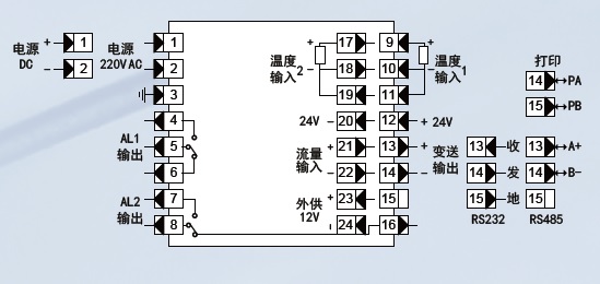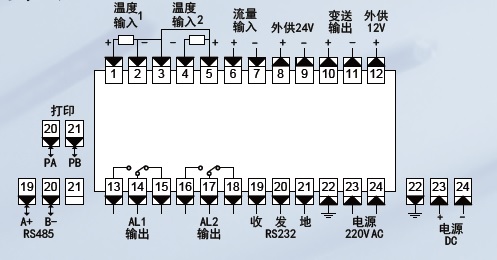 ② 温度(热电阻、热电偶)、流量(电流、电压、脉冲)输入,基本误差优于±0.2%F·S;