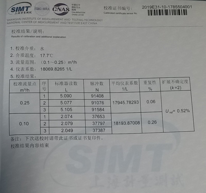 2 )重复性好,短期重复性可达 0 . 05 %一 0 . 2 % ,正是由于具有良好的重复性,如经常校准或在线校准可得极高的精确度,在贸易结算中是优先选用的流量计。